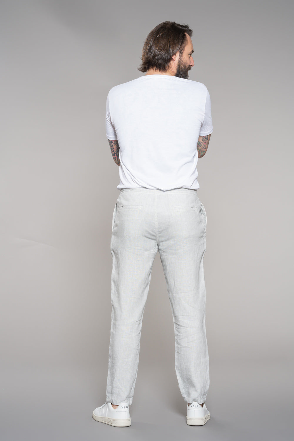 Leinen-Jogpants Der perfekte Sommerbegleiter Gerades Bein Zwei Taschen vorne und zwei Paspel-Eingriffstaschen hinten Kombinationsmöglichkeiten: Mit einem Leinenhemd oder T-Shirt stylt man einen entspannten, sommerlichen Look. Unser fv-Ma:ts kann aber auch mit einem Hemd im Büro getragen werden. Ausstattung: Knöpfe aus Edelstahl, nickelfrei; YKK-Reißverschluß aus Metall Das Model trägt auf den Bildern die Gr. 33/32